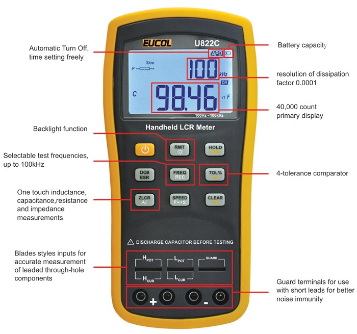 Sie erhalten mit dem U288C ein 4 Leiter Hand LCR Meter hoher Genauigkeit mit dokumentierten Schnittstellenbeschreibung zu einem sehr günstigen Preis! Besonderheiten des U822C / Features